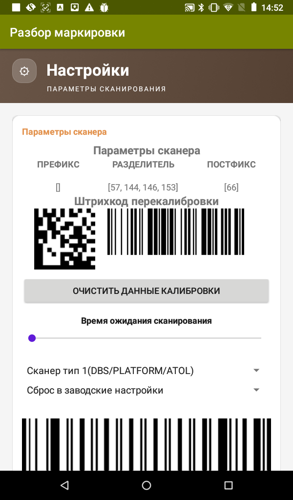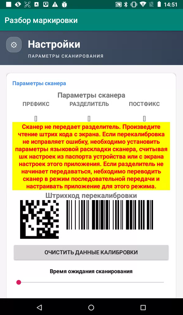 На экране появится окно параметров сканера: передача префикса, разделителя и постфикса; предупреждение о разделителе на желтом фоне; штрихкоды перекалибровки и фильтр типа кодов.
