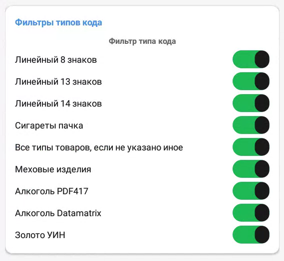 Для исправления данной ошибки необходимо перейти в приложение Настройки сканера на второй странице рабочего стола кассы → зеленая шестеренка → пролистнуть вниз до Фильтра типа кодов и активировать нужные ползунки. По умолчанию они все активированы.