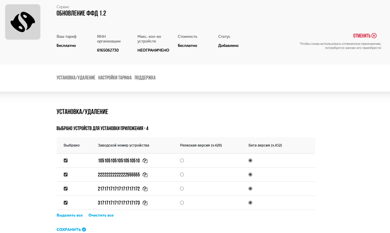 - Введите название приложения: Обновление ФФД 1.2 (на кассе это приложение называется ЛаунчерФР). Выберите его и добавьте. В открывшемся окне выберите вашу кассу и бета версию приложения.