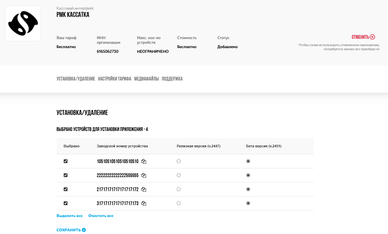- Далее введите в поисковую строку маркета приложение: РМК Кассатка (на кассе приложение называется просто Кассатка). Выберите его и добавьте. В открывшемся окне выберите вашу кассу и бета версию приложения.