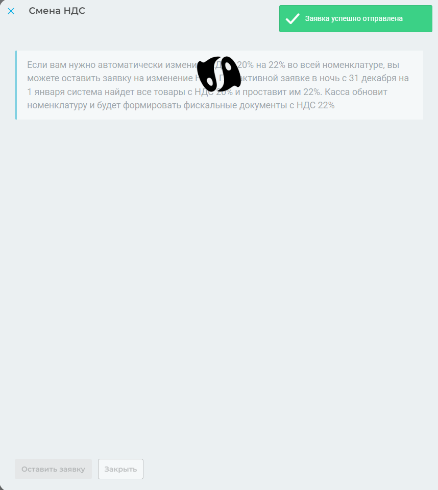 В личном кабинете есть возможность оставить заявку на автоматическую смену НДС с 20% на 22%. У всех пользователей, которые оставят заявку, в ночь с 31 декабря на 1 января система пройдет по товарам и услугам в номенклатуре со ставкой 20% НДС и заменит ее на 22%.