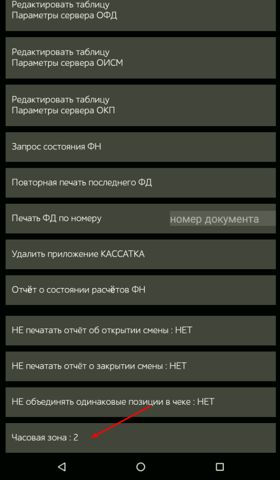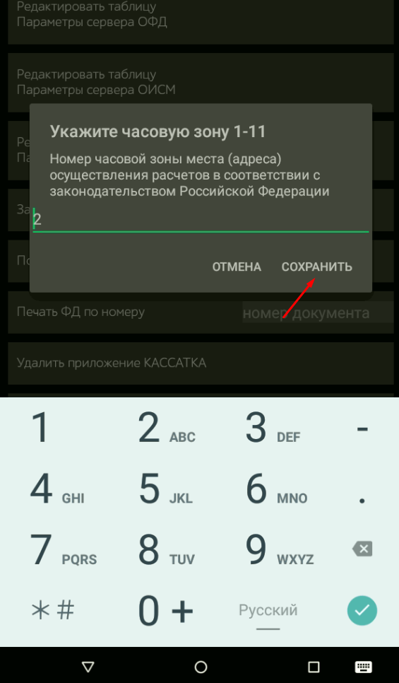 - На самой кассе необходимо перейти из главного меню в раздел Настройки → Сервис ККТ → Часовая зона. Укажите нужную и нажмите кнопку Сохранить.