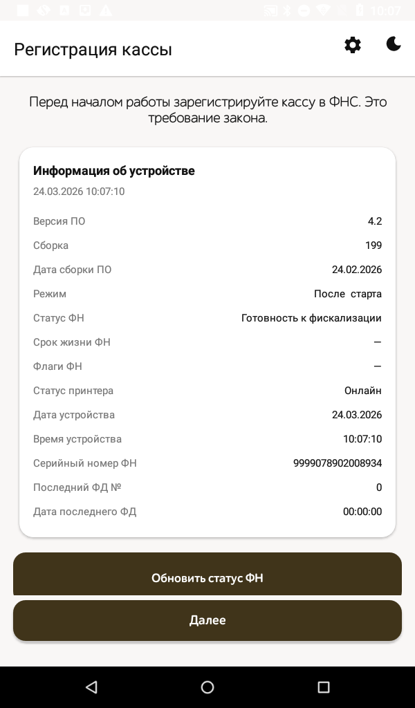 Переходим из главного меню кассы в Мастер регистрации. В открывшемся окне отобразится актуальная информация об устройстве.