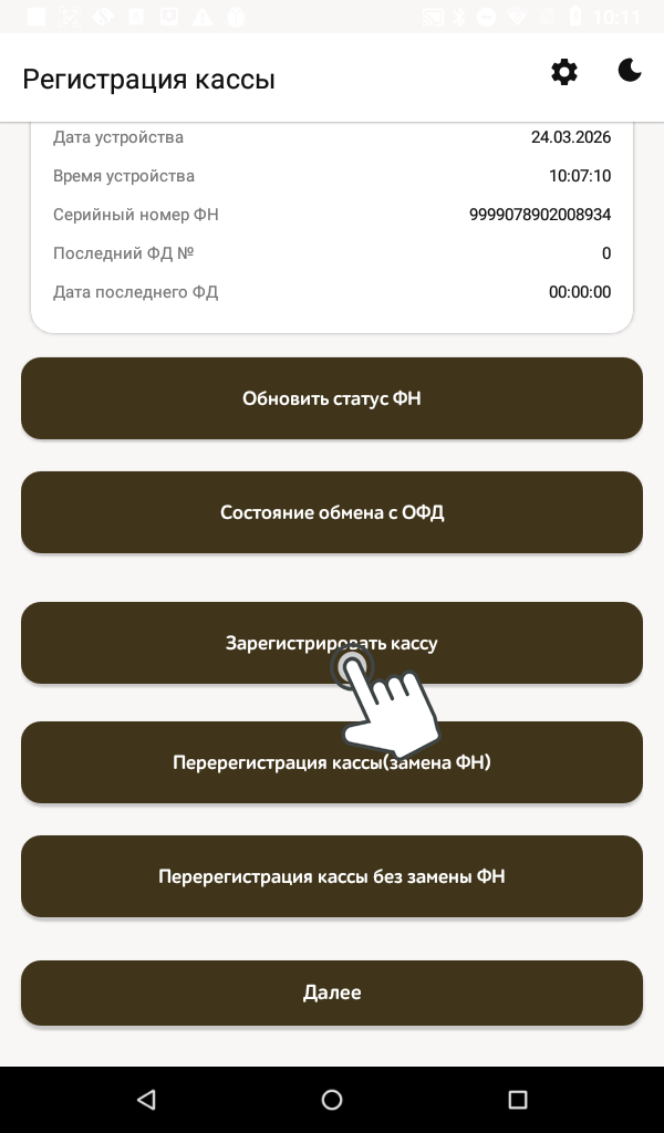 Пролистываем меню вниз, нажимаем кнопку Зарегистрировать кассу.