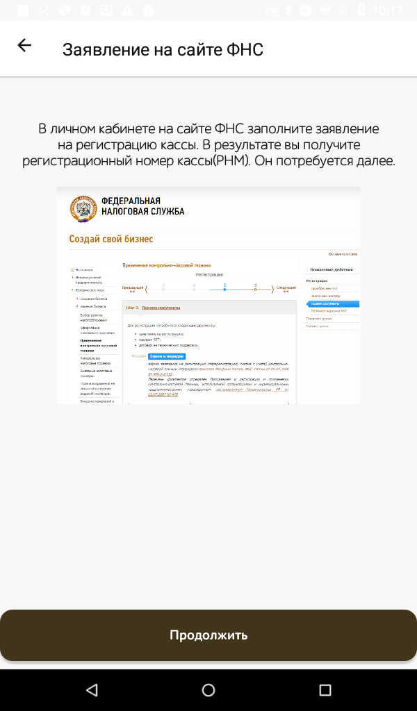 - Касса напомнит вам о заявлении на сайте ФНС для получения регистрационного номера, нажимаем Продолжить.