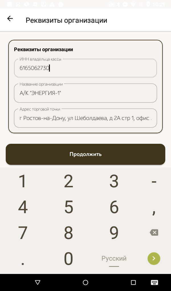 - Указываем реквизиты организации, нажимаем Продолжить.