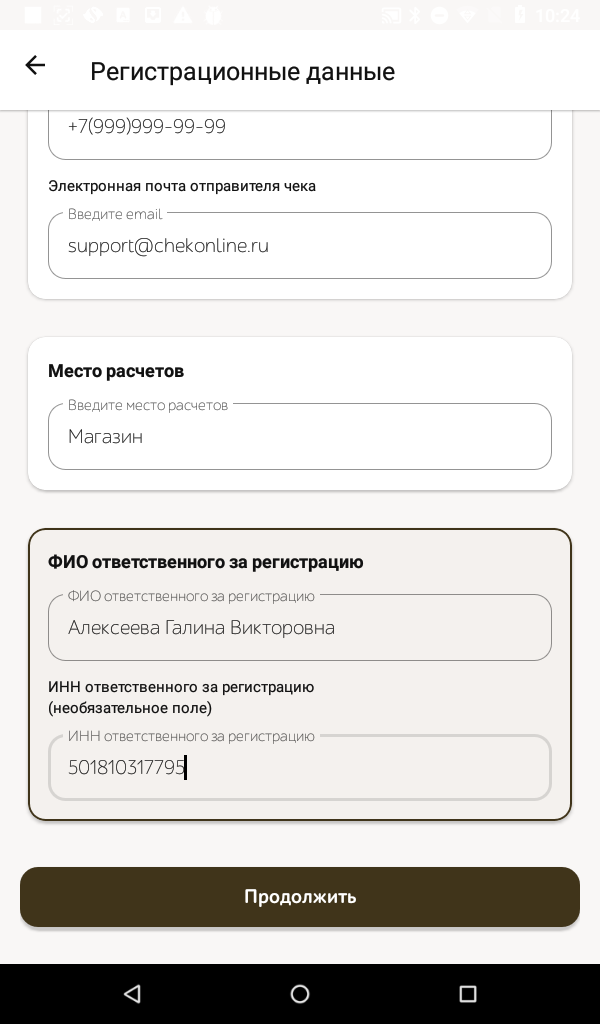- Указываем регистрационный номер кассы, полученный в ФНС. Нажимаем Продолжить.