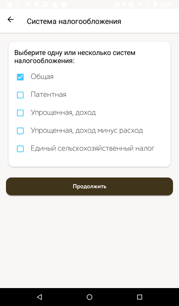 - Выбираем систему налогообложения, нажимаем Продолжить.