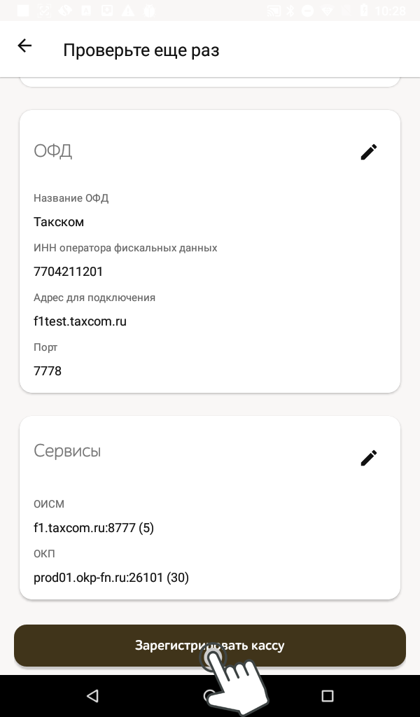 - Перепроверяем введенные данные. Если потребуется корректировка, то можно будет изменить данные по иконке карандаша сверху справа. Нажимаем кнопку Зарегистрировать кассу.