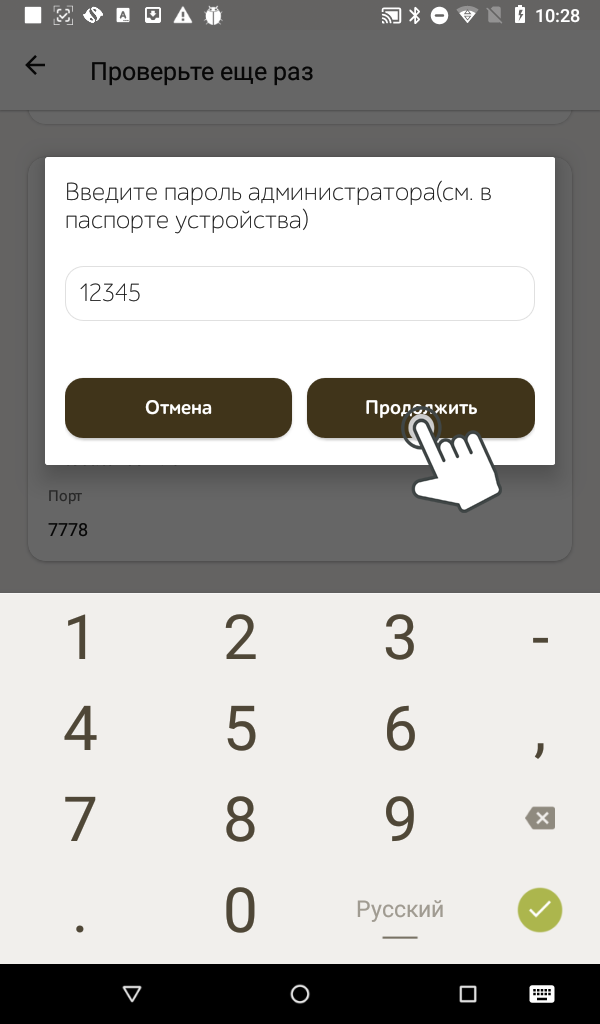 - Вводим шестизначный пароль администратора и нажимаем на кнопку Продолжить. Пароль администратора можно найти в паспорте устройства, на наклейке на торце коробки от ККТ или в личном кабинете в разделе Рабочие места.